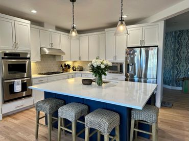The heart of the renovation was the kitchen. To create a more modern and open feel, we removed the outdated soffit, instantly updating the space. We replaced the cabinetry, shifting from the original oak finish to a crisp white, while introducing a navy blue island to tie in beautifully with the blue elements found throughout the home. Adjusting the island’s placement allowed for better functionality and improved flow, making the kitchen more intuitive and spacious. Thoughtfully selected finishes and refined details brought the design together, creating a space that is both modern and timeless—perfect for gathering, cooking, and everyday living.